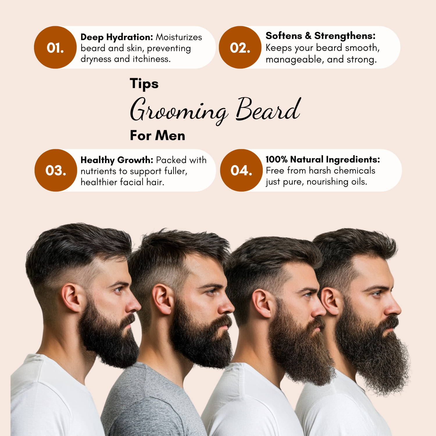 ✔ Gently massage into your beard, ensuring even coverage from root to tip.